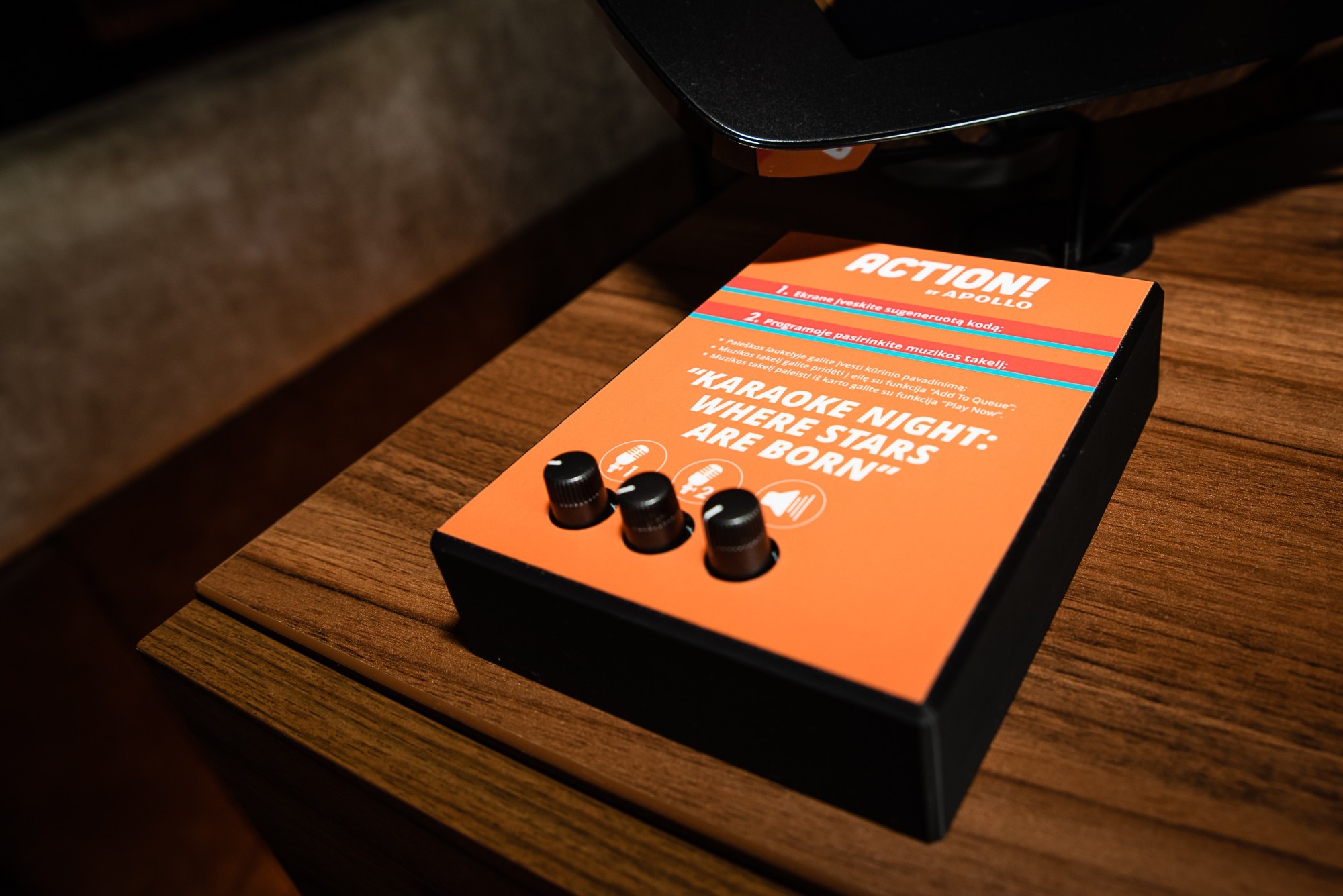Karaokė vyksta „ACTION! by Apollo“ pramogų centre, kuris garsėja jaukia aplinka ir moderniomis pramogomis. Čia jūsų laukia privati karaokė salė, talpinanti iki 20 asmenų – puikus pasirinkimas gimtadieniams, įmonės vakarėliams ar smagiam laisvalaikiui su draugais. Grojaraštyje rasite populiarias lietuviškas ir užsienio atlikėjų dainas, tad kiekvienas atras savo mėgstamą hitą. Vakarą dar malonesniu padaro galimybė pasirinkti iš klasikinio amerikietiško ir „street food“ meniu, kuriame taip pat siūlomos veganiškos ir vegetariškos opcijos, o prie maisto galima užsisakyti gėrimų iš plataus baro asortimento.