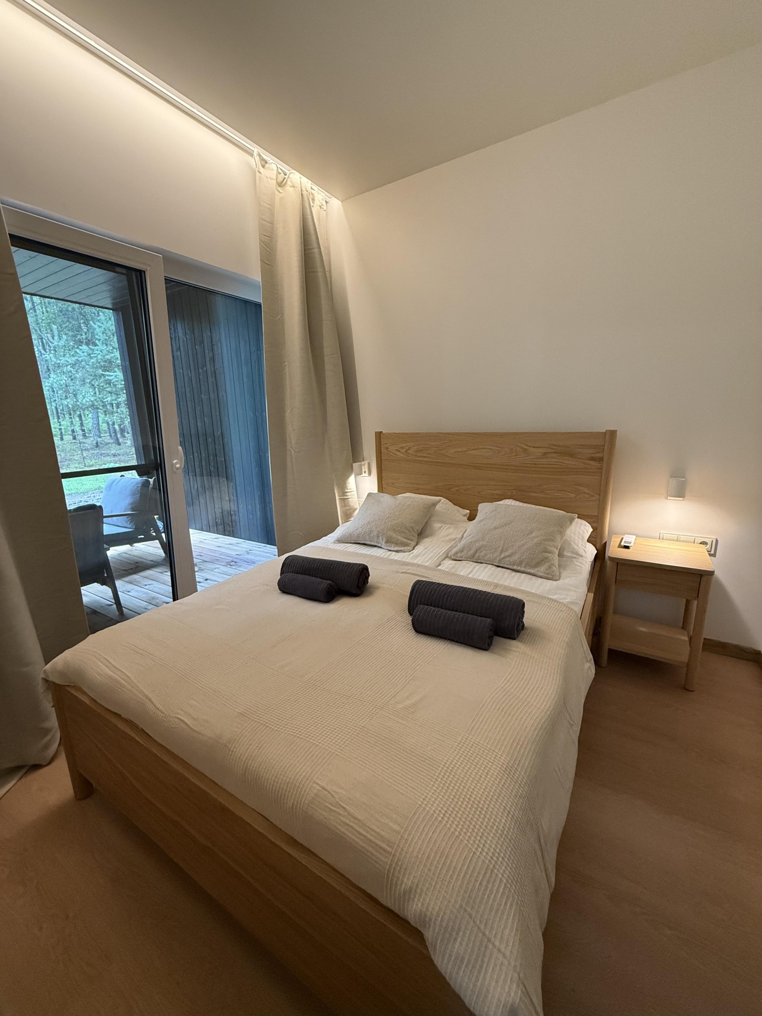Laisvalaikio kompleksas „Miško kortai“ – tai ypatinga poilsio vieta gamtos apsuptyje, kur ramybė ir natūralumas dera su komfortu. Čia kiekviena detalė apgalvota taip, kad padėtų pabėgti nuo miesto ritmo, įkvėpti gryno oro ir pasimėgauti tikru poilsiu. Ši vieta sukurta tiems, kurie vertina gamtos grožį, jaukumą ir lėtą laiką – kai dienos teka ramiai, o vakarai kupini tylos ir miško garsų. Namelis su atskiru miegamuoju – tai jaukus poilsio kampelis, kuriame viskas skirta patogiam buvimui gamtoje. Namelyje įrengta virtuvė su kaitlente, šaldytuvu, indais ir įrankiais, vonios kambarys su dušo želė, šampūnu bei rankšluosčiais, svetainės zona su televizoriumi, pledukais ir stalo žaidimais. Namelis sukuria ypatingą jaukumą ir leidžia pasinerti į ramų poilsį miško apsuptyje.