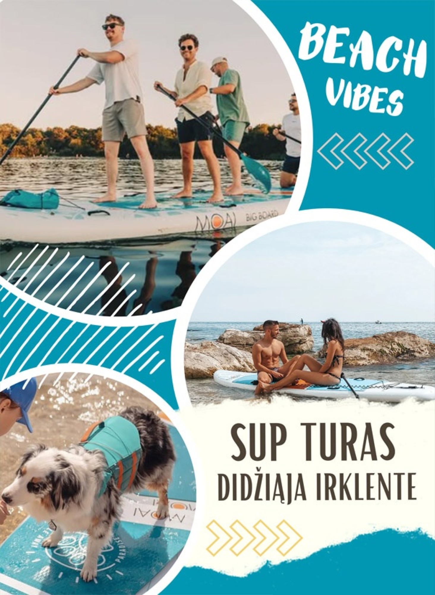 • plaukimas dviem didžiosiomis SUP irklentėmis grupei (viena irklentė iki 180 kg). Galimi variantai ant vienos irklentės: 2 suaugę + 2 vaikai, 2 suaugę + 1 vaikas + 1 šuo, 2–3 suaugę;
